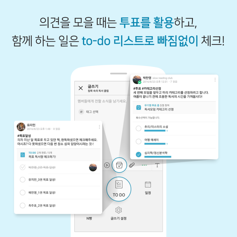 친구, 가족, 동료들과 함께 사진, 동영상, 글 등을 공유하며, 일정 관리와 투표 기능 등 다양한 도구를 제공합니다.