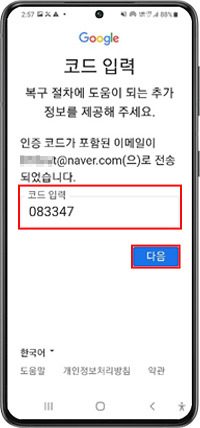 안내에 따라 이메일 또는 문자로 전송된 코드를 입력하여 비밀번호를 새로 설정합니다.