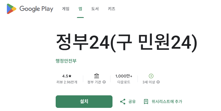- 설치 : 검색 결과에서 '정부24(구 민원24)' 앱을 선택한 후, '설치' 버튼을 클릭합니다.