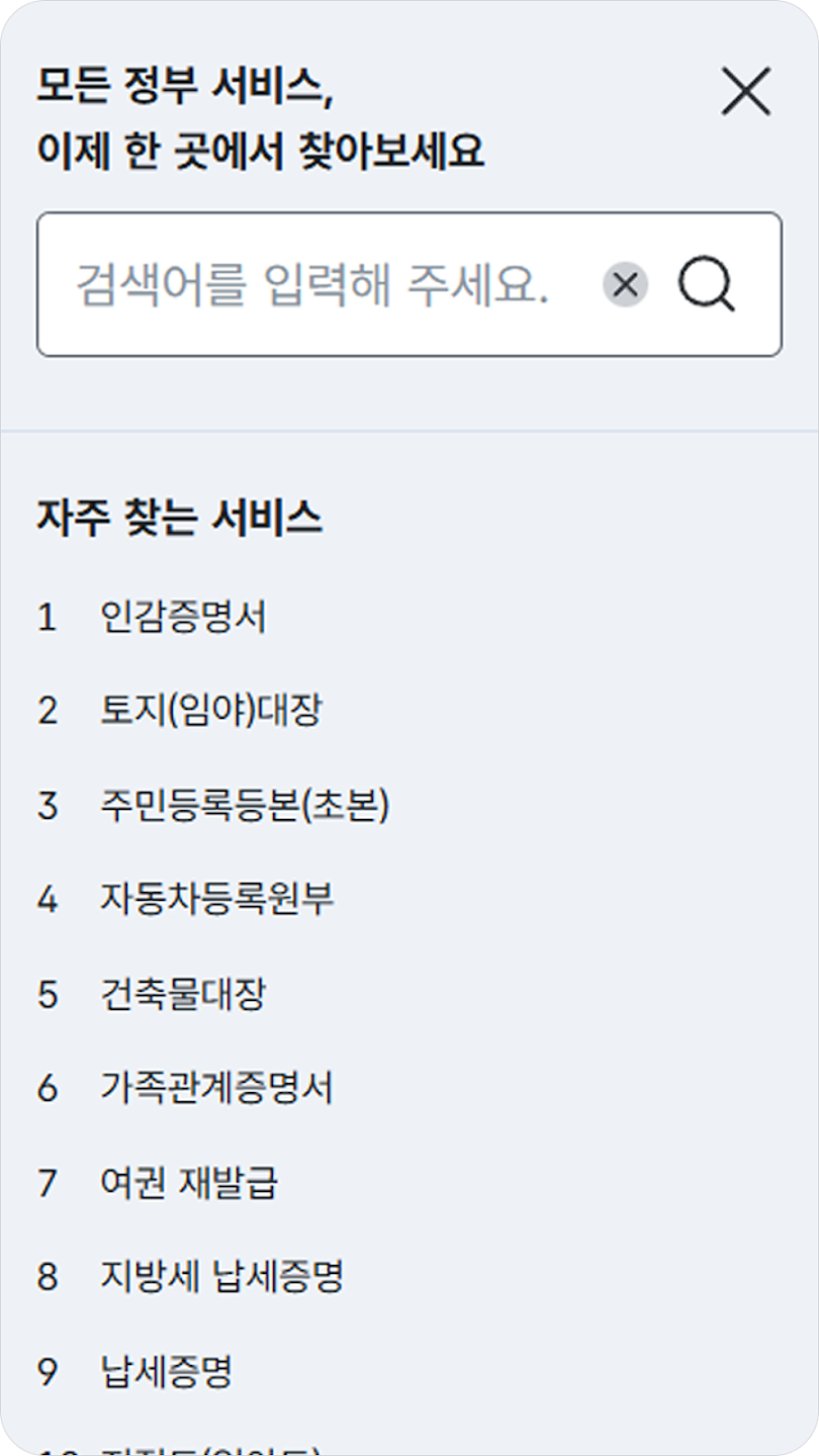 - 민원 서비스 : 주민등록등본, 가족관계증명서 등 각종 증명서를 모바일로 발급받을 수 있습니다.