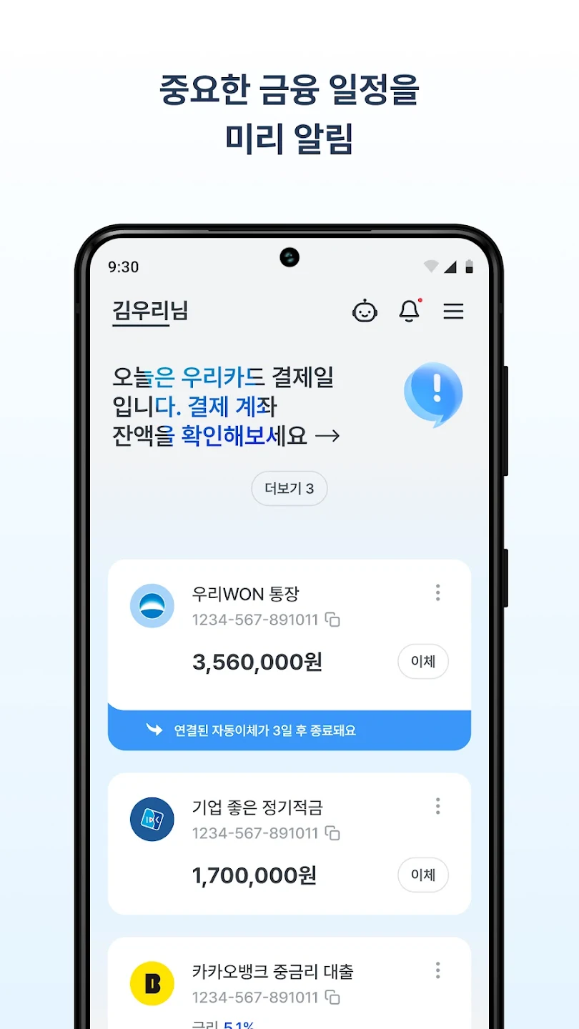 - 대출 신청 : 필요한 경우 대출 상품을 신청할 수 있는 기능도 제공됩니다.