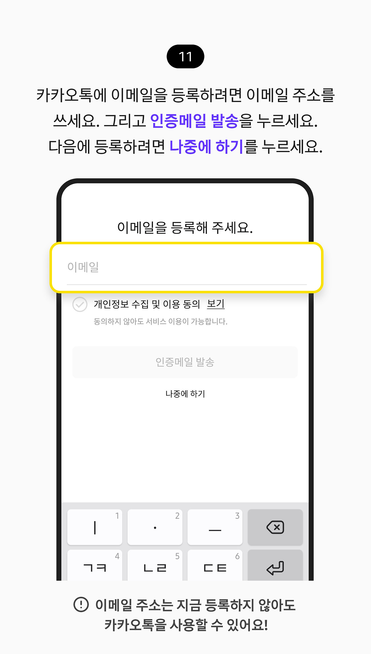 - 로그인 : 카카오 계정으로 로그인하거나, 한메일 아이디와 비밀번호를 입력하여 로그인합니다.