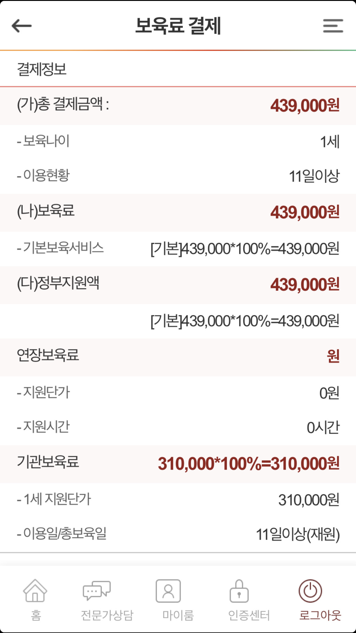 - 로그인 후, '보육료 결제' 메뉴를 선택합니다.