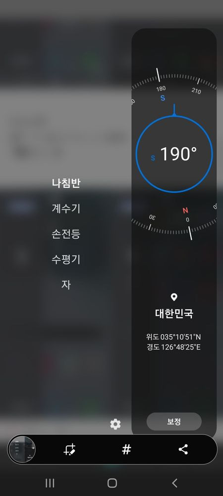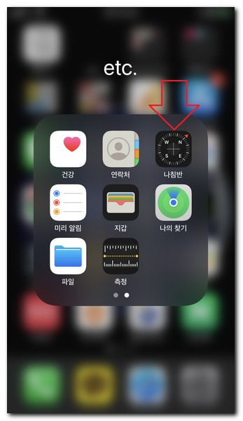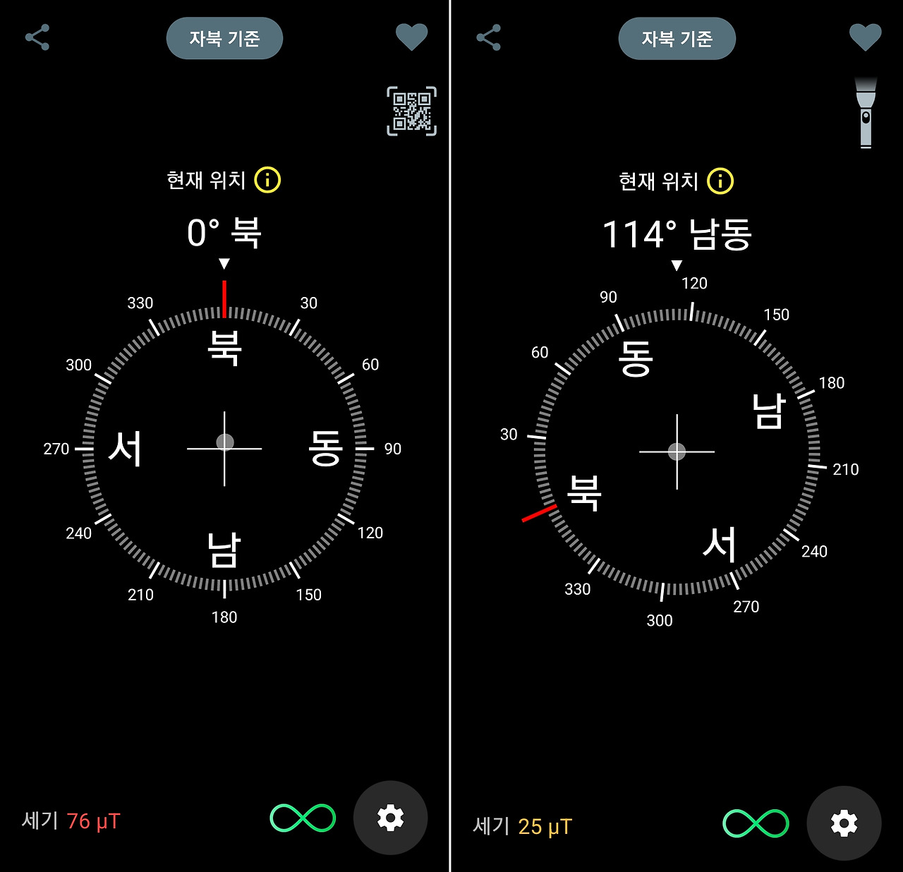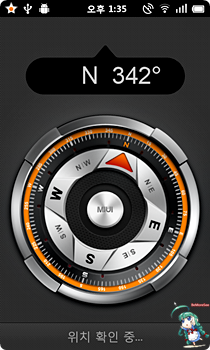 각 어플의 사용 방법은 비슷합니다. 첫 번째로 어플을 다운로드 후 실행하면, 대개 화면 중앙에 나침반 바늘이 표시됩니다.
