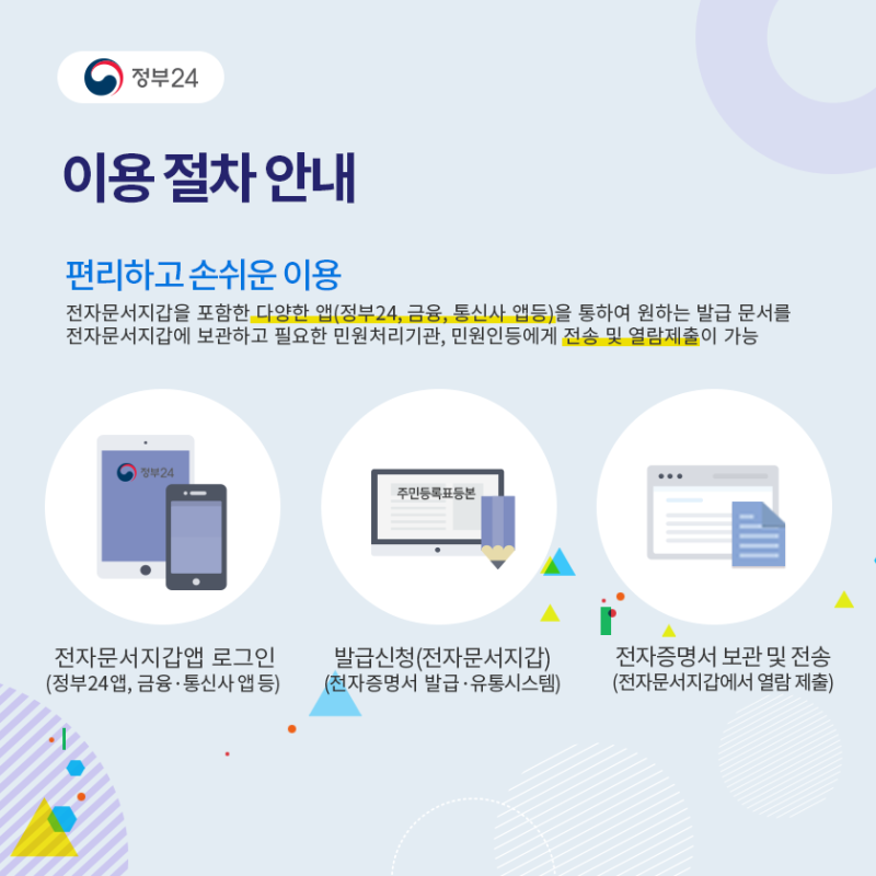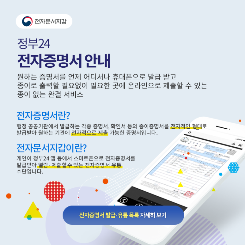 - A: 전자증명서는 정부민원 24시 앱을 통해 발급받아 사용할 수 있습니다.