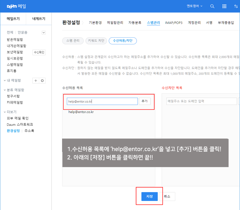 - 다음 이메일의 스팸 차단 기능은 어떻게 설정하나요?