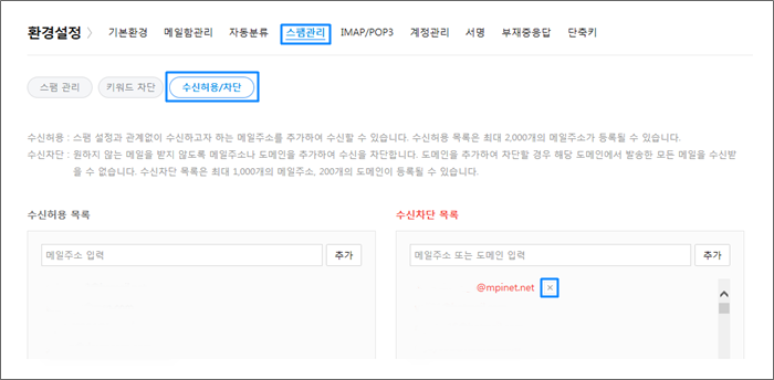 스팸 메일이 많이 들어오는 경우, 스팸 차단 기능을 활용하면 편리합니다.