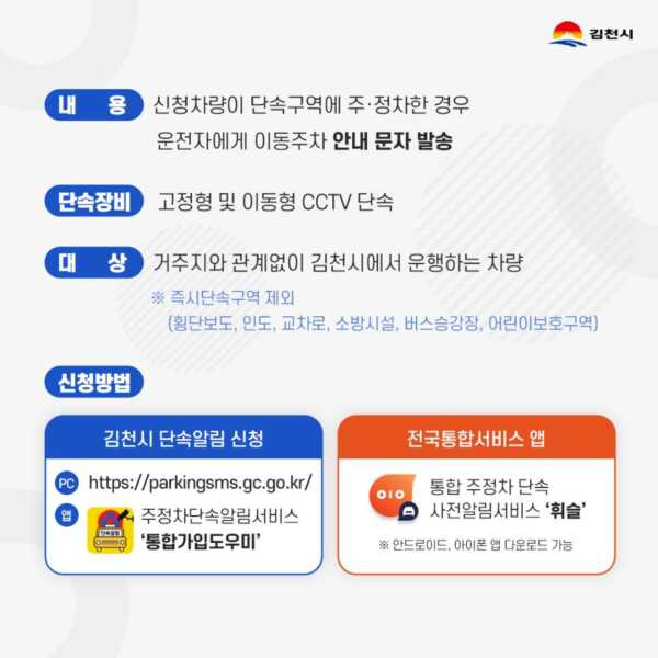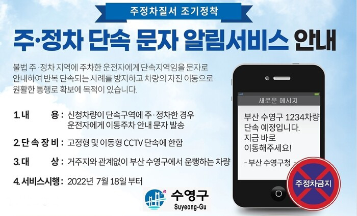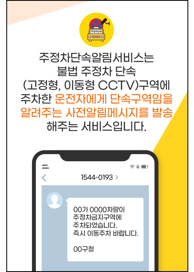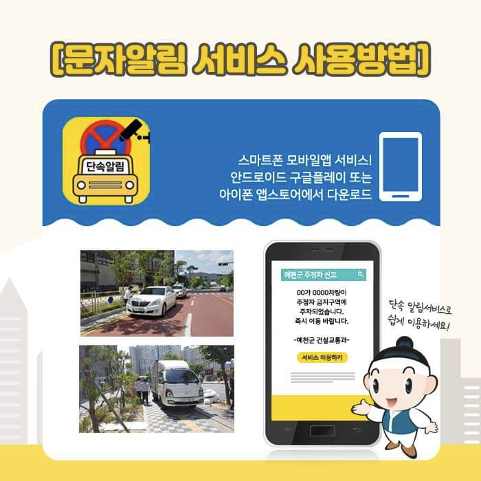 이 서비스는 차량이 불법으로 주정차된 경우, 해당 차량의 소유자에게 문자 메시지를 통해 즉시 알림을 보내주는 기능을 제공합니다.