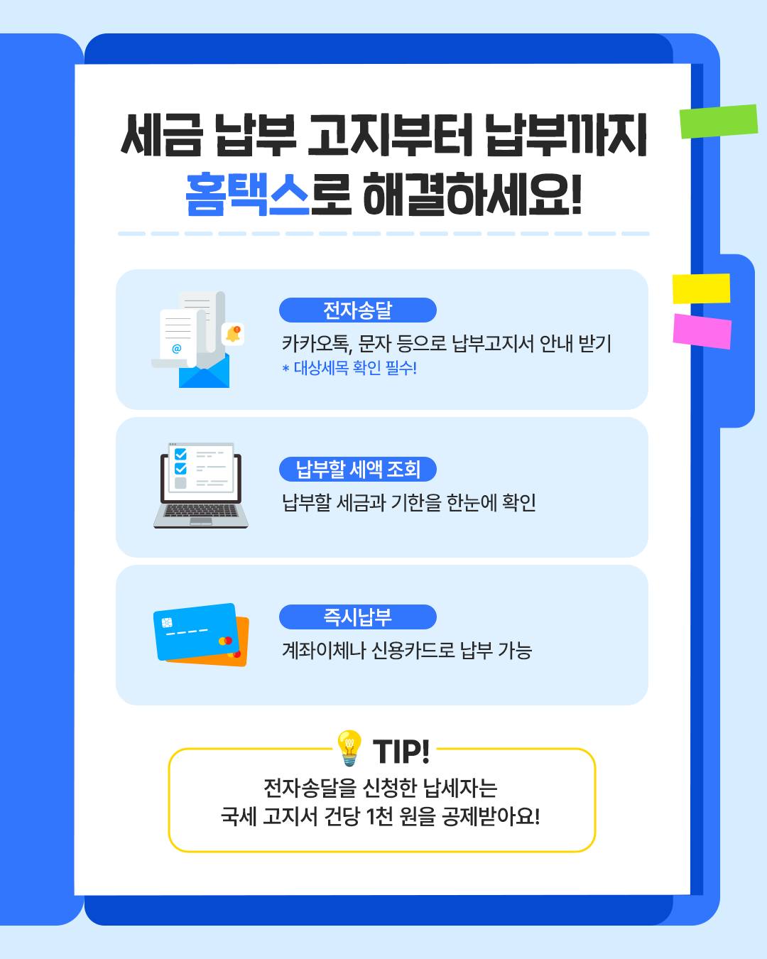 - 세금 납부 : 전자납부를 통해 카드, 계좌이체 등으로 손쉽게 세금을 납부할 수 있습니다.