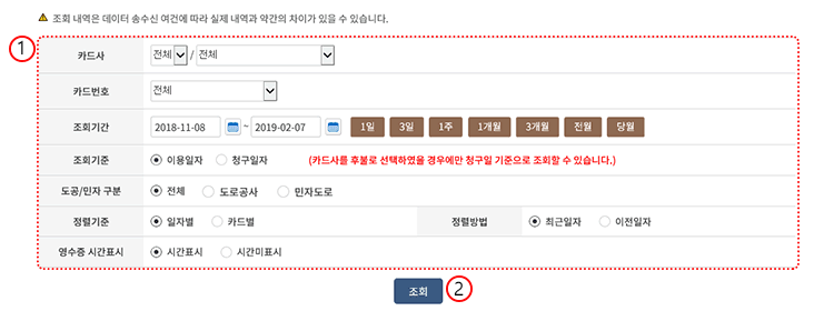 - 조회 조건 입력 : 조회하고자 하는 기간, 카드사, 사용자 정보 등을 입력합니다.