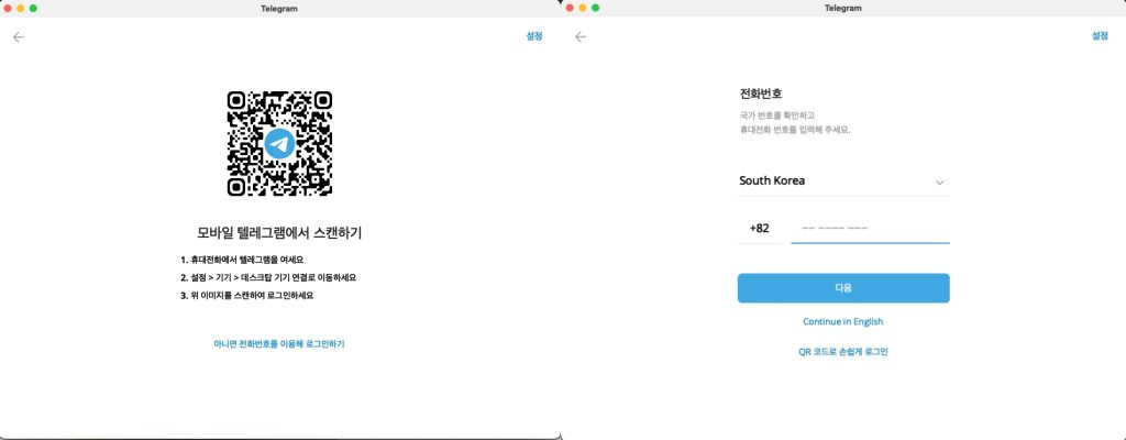 설치가 완료되면 텔레그램을 실행하고, 전화번호를 입력하여 인증을 받습니다.