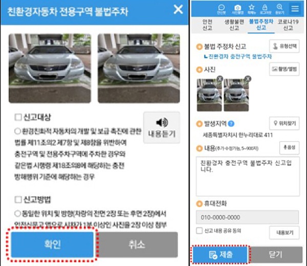 과태료 부과로 이어지는 유효한 신고를 위해 동일한 위치에서 1분 이상의 시차를 두고 사진 2장을 촬영해 보세요.