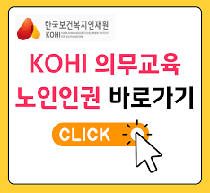 가장 먼저 노인복지법에 따른 법정 의무 교육을 이수하기 위해 보건복지부 지정 전문 교육 기관인 한국보건복지인재원(KOHI) 의무교육 포털에 안전하게 접속하시기 바랍니다.