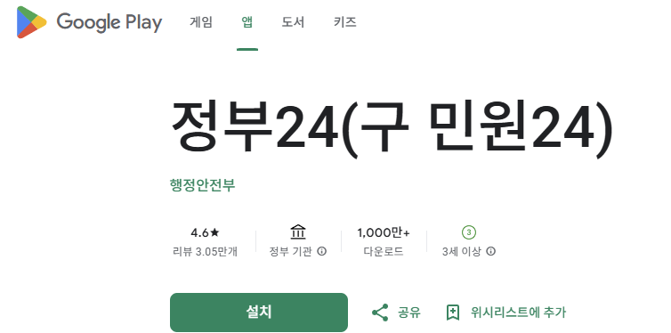 - 앱 선택 : 검색 결과에서 '정부24(구 민원24)' 앱을 선택합니다.