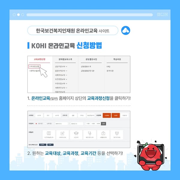 수강 신청은 매우 간단합니다. 한국보건복지인재원 온라인 교육 홈페이지에 접속한 후, 원하는 교육 과정을 선택하고,