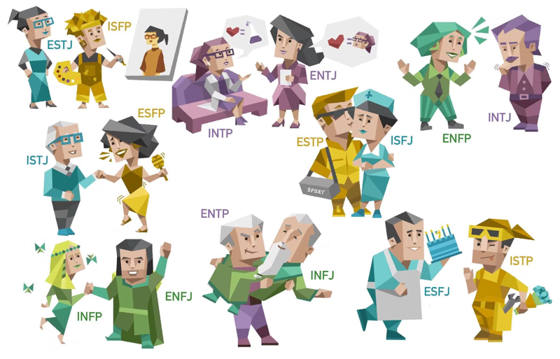 이 네 가지 차원에서 각각의 선택이 조합되어 16가지 성격 유형이 만들어집니다.