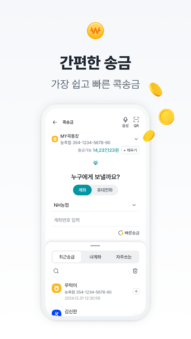 - 간편 송금 : 친구나 가족에게 쉽게 송금할 수 있는 기능입니다. 전화번호만으로도 송금이 가능하여 매우 편리합니다.