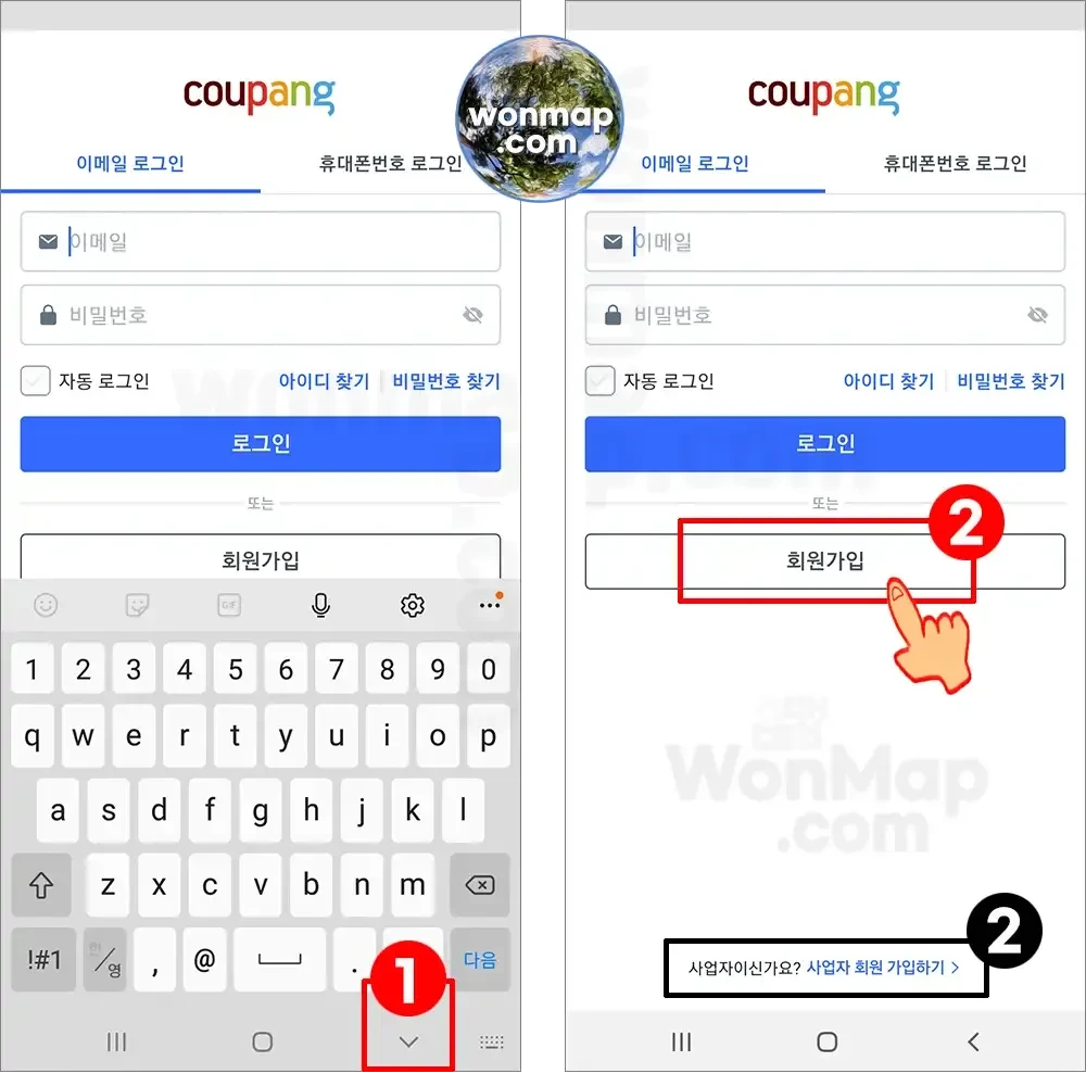 - 앱 실행 후 회원가입 선택 : 앱을 실행한 후, 하단 메뉴에서 '마이쿠팡'을 선택하고 '회원가입'을 클릭합니다.